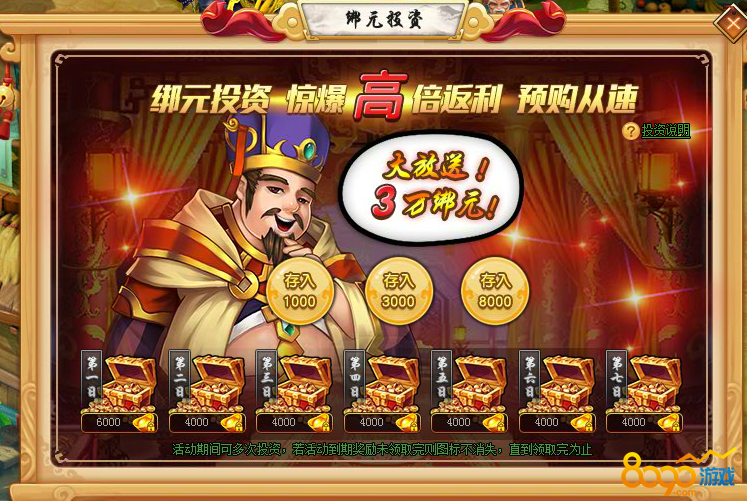 【活动内容】玩家期间玩家可进行元宝投资,元宝投资越多获得的绑元返还越多!