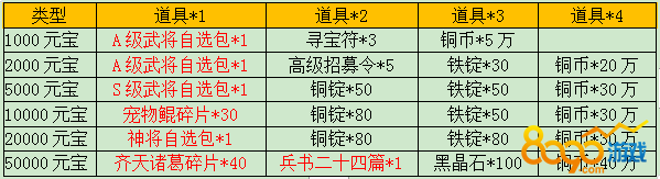 【活动内容】活动期间,玩家每消费4999元宝即可领取猛将典韦碎片*5,体力*30,限领取8次。