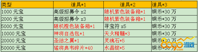 【活动内容】活动期间,玩家每充值5000元宝即可领取猛将典韦碎片*5、阅历*1000(限领取8次)。