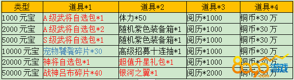 【活动内容】活动期间,玩家每累充5000元宝可以获得龙胆赵云碎片*5+绑定元宝*500(限领取8次)。