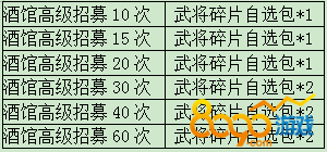 【活动内容】活动期间,玩家酒馆高级招募达到指定次数即可领取道具奖励(S级武将自选包(袁绍碎片*10、颜良碎片*10、文丑碎片*10))。