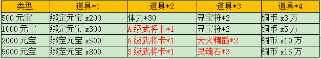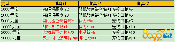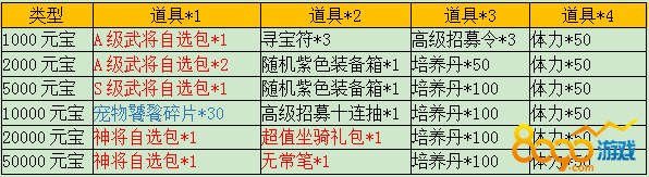 【活动内容】活动期间,玩家三日累积充值10000元宝即可领取神将自选包*1+体力*100。