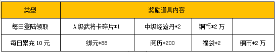 【活动内容】活动期间,玩家每天登录游戏,即可领取一份登录福利礼包,当日累充满10元还可再额外领取一份丰厚奖励!
