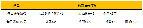 【活动内容】活动期间,玩家每天登录游戏,即可领取一份登录福利礼包,当日累充满10元还可再额外领取一份丰厚奖励!