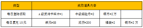【活动内容】活动期间,玩家每天登录游戏,即可领取一份登录福利礼包,当日累充满10元还可再额外领取一份丰厚奖励!