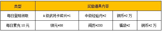 【活动内容】活动期间,玩家每天登录游戏,即可领取一份登录福利礼包,当日累充满10元还可再额外领取一份丰厚奖励!