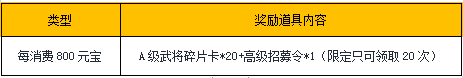 【活动内容】活动期间,玩家每消费410元宝即可领取超值礼包一份,礼包内容为:绑元*200+高级招募令*1(限定只可领取20次)。