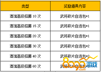 【活动内容】活动期间,每日酒馆高级招募达到指定条件,即可领取一份武将碎片奖励。