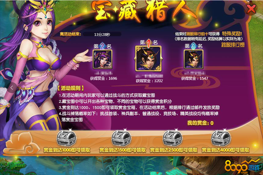 【活动内容】活动期间,玩家可通过挖宝获得宝藏赏金积分,积分达到指定额度即可获得奖励一份,同时还可参与积分排行榜获得排行榜奖励!