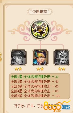 中原豪杰需要三个武将分别为淳于琼,田丰和于禁三个武将,并且属性加成会随着武将的星级越高加成也就越高,全体1星:全体武将物理攻击+20.全体2星:全体武将物理攻击+40,全部3星:全体武将物理攻击+60,全部4星:全体武将物理攻击+80.全部5星:全体武将物理攻击+100.除了武将本身的属性之后,激活武将之间的羁绊增加的属性也是非常的高的。