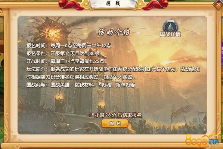 搜索"8090网页游戏"国战作为乐蜀三国中的一个最有趣的活动,是全平台的活动,所有平台的玩家在里面相互竞技,从而获得国战英雄,稀缺材料,s将魂,新神将等奖励。