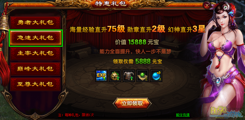 (2) 急速大礼包(需5888元宝):