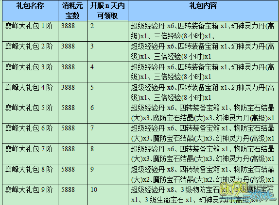 (1) 幻神10星:幻神灵力丹(高级)x3、绑定元宝(1000)x2、宝藏钥匙x10