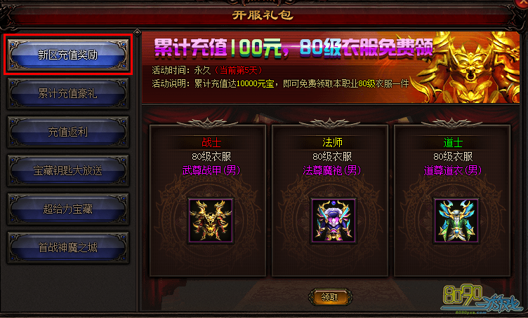 活动说明:累计充值达10000元宝(即100元),即可免费领取本职业80级衣服一件