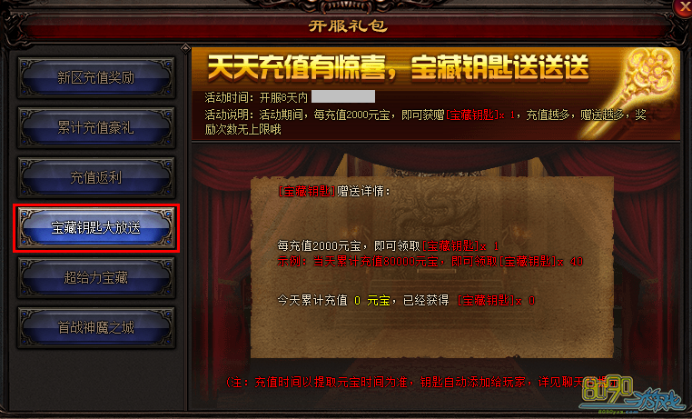 活动说明:活动期间,每充值2000元宝,即可获赠[宝藏钥匙]x1,充值越多,赠送越多,奖励无上限