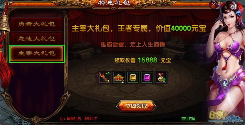 主宰大礼包,王者专属,价值40000元宝,雄霸雷霆,走上人生巅峰,领取仅需15888元宝