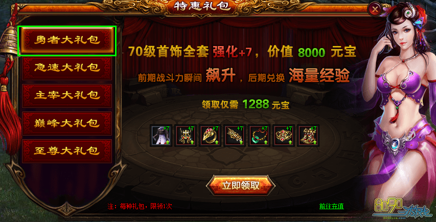 (1) 勇者大礼包(需1288元宝):