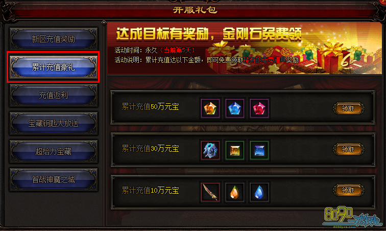(1)累计充值10万元宝(即1000元),奖励:3转职业武器x1、2级物防宝石x1、2级魔防宝石x1