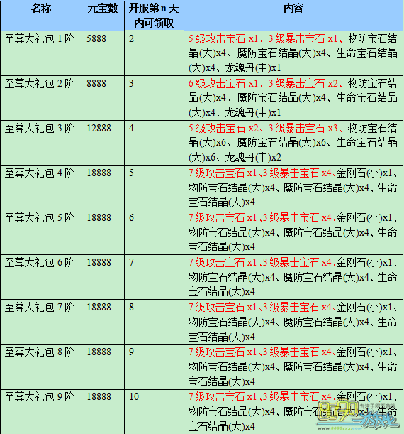 转生1阶武器(逆火战刃、镇魂法杖、离火翎扇)强化+9、超级金币箱x2、5级攻击宝石x1、5级暴击宝石x1、直升二阶军衔x1