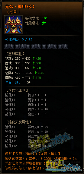 1、 佩戴龙帝神剑、龙帝神甲后,即激活套装属性:暴击力+2000、伤害吸收+2%,以及专属全屏神技[雷霆之怒]
