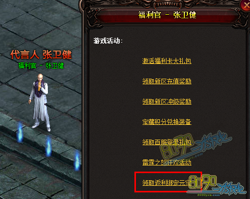 活动说明:活动期间,充值成功后,可在雷霆之城NPC“福利官-张卫健”处,领取充值元宝数的20%的绑定元宝返利,充值越多,返利越多哦