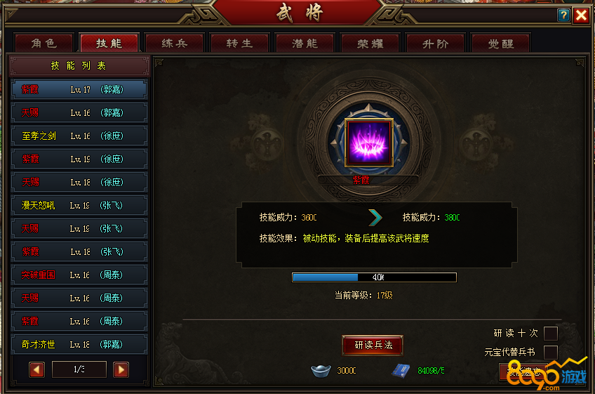 2. 武将技能:用以提升武将本身穿戴的技能,需要消耗技能书和银两