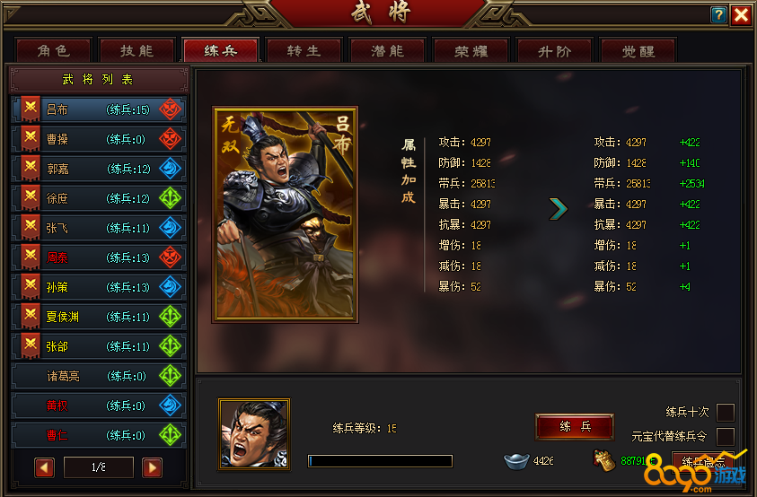 3. 武将练兵:消耗练兵符合银两对武将所带兵种进行属性加成