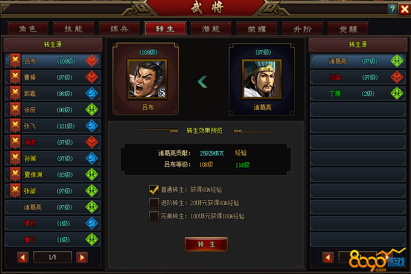 4. 武将转生:可将已培养的武将进行下阵与上阵武将进行资源转换