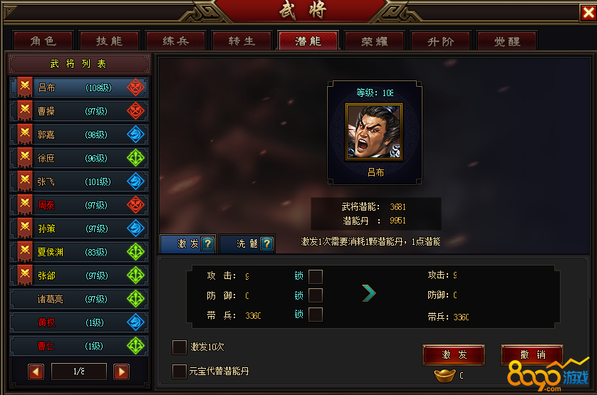 5. 武将潜能:消耗一定的潜能丹对武将潜能进行激发,如果不想激发某个属性可进行勾选即可