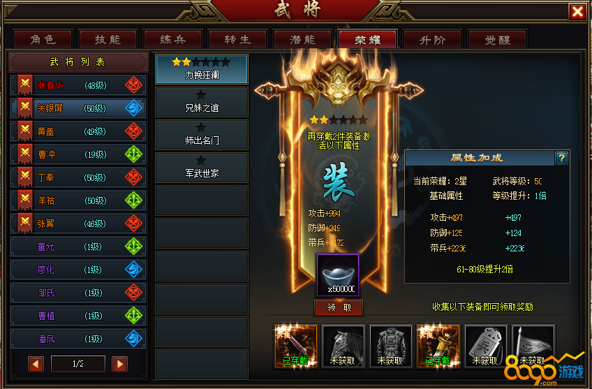 6. 武将荣誉:武将穿戴缘分装备可激活一定的属性,40级后随着玩家等级提高属性也会增加
