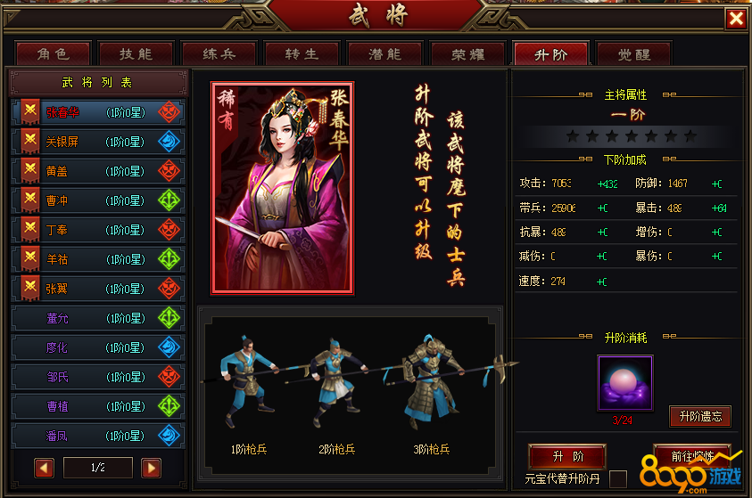 7. 武将升阶:武将消耗一定的升阶丹(对多余的武将碎片进行熔炼获得)可进行升阶操作,升阶后武将属性将会有一定增加
