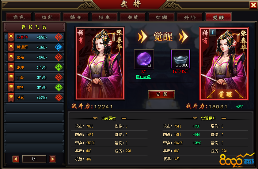 8. 武将觉醒:消耗一定的天命石和银两可对武将进行觉醒,觉醒后武将的属性将会有一定增加