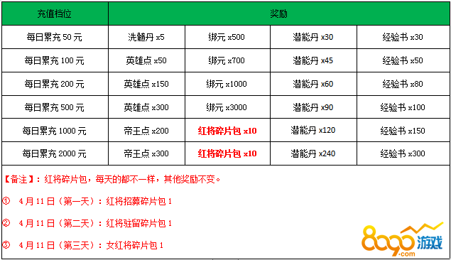 【活动内容】活动期间,每日累计充值达到指定额度即可领取对应奖励。