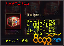 【备注】:红色武器自选包:在游戏【充值寻宝】中已有的道具