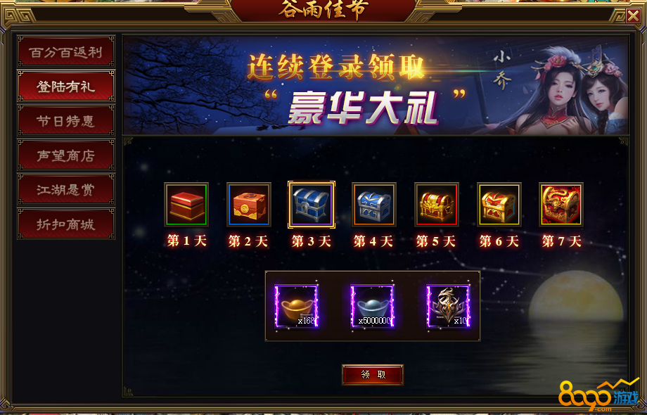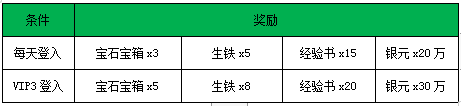 【活动内容】活动期间,每天登陆都可免费领取一份奖励,vip3用户可以额外多领一份奖励。