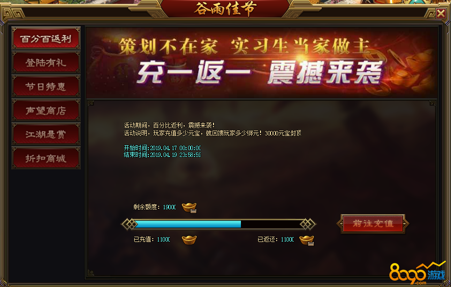 【活动内容】活动期间,充值多少就返还多少,30000绑元封顶。