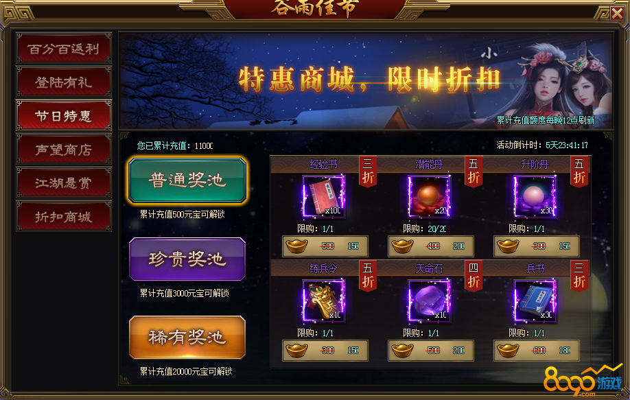 【活动内容】活动期间,累计充值达到指定金额即可解锁奖池,购买超低折扣道具。