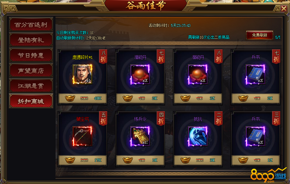【活动内容】活动期间,可在折扣商城购买折扣道具,折扣道具可以通过刷新变换。