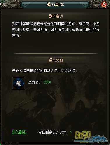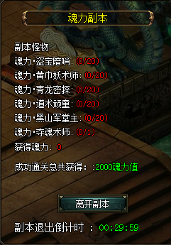 在王城处领取魂力副本任务后,将会被传送进副本地图四神殿内,按照要求击杀相应数量的怪物并且达到要求后。会获得相应的魂力及通关奖励。副本完成后点击离开传送回王城即可。