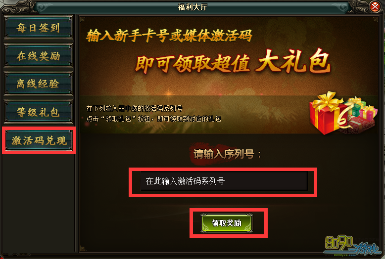 【步骤2】福利大厅界面点击“激活码兑换”按钮,在输入框内输入相应礼包码点击领取奖励后,即可领取到对应奖励。