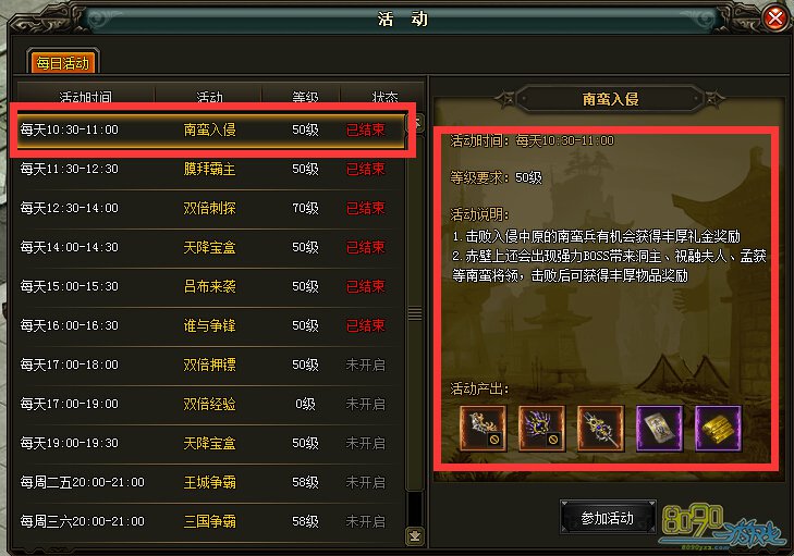 活动开启后,会在屏幕右上方显示如图所示的图标以及活动倒计时。赤壁地图会一次性刷出大量普通怪及少量的BOSS,击杀怪物和BOSS会掉落大量的道具装备及礼金。