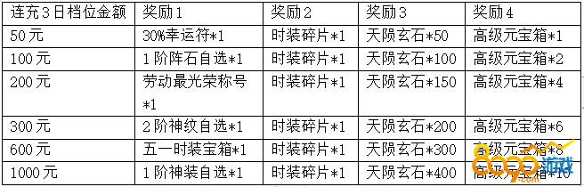 2、三日连充——在活动期间内,连续3日充值指定档位金额,可在第3日充值达标后,领取稀有神装、节日称号、节日时装等各种珍贵奖励噢。