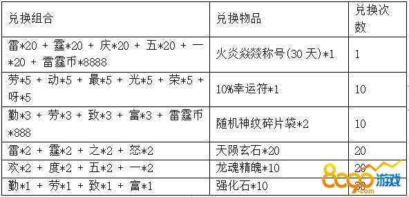 1、活动期间内,集齐指定的文字和雷霆币组合,即可兑换对应丰厚奖励。