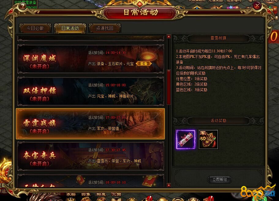在雷霆战旗地图内,PK不增加PK值,死亡有几率爆出装备。活动期间,玩家站在战旗附近的光点上,每5秒可获得对应倍数的随机奖励。其中, 任意位置点,为1倍奖励;黄色区域点共有8个,这些区域点为2倍奖励;蓝色区域点共有4个,这些区域点为3倍奖励。