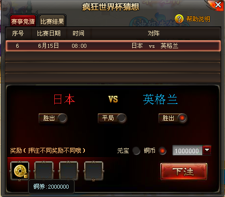 2.每天12点公布当天比赛结果,并用邮件发放奖励给各位竞猜胜利的玩家;