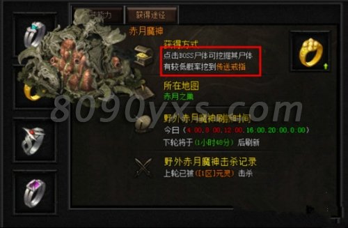 挖掘赤月魔神的尸体有可能会获得传送戒指、隐身戒指、复活戒指或者麻痹戒指,获取传送戒指后只要你点击小地图某一坐标点即可进行时空传送,冷却时间1分。当然也有可能获取隐身戒指,使用后5秒内怪物和玩家都看不到你的踪影哦!如果你使用麻痹戒指,所有职业的伤害均有1/15的概率麻痹对方持续5秒,不过,群体攻击只能造成1人麻痹,持续伤害的技能只有首次受到伤害的对象才会有几率被麻痹。复活戒指可以在生命值下降为0时立即为您恢复20%的血量。