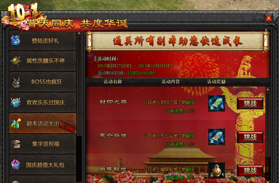 活动内容:活动期间内,挑战副本(封印之塔、死亡谷地、幽禁秘地、试炼之地)进入次数翻倍。挑战副本贺国庆,更多挑战次数,得更多奖励!