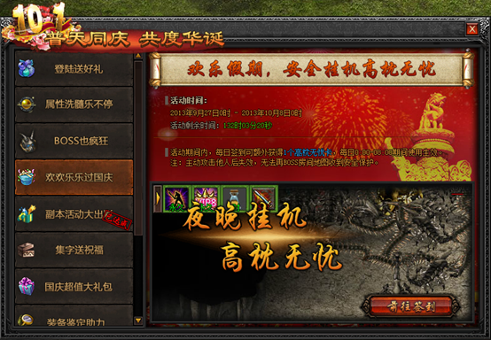 活动内容:十月激情,一起嗨皮!国庆盛典,好礼尽在国庆活动!在活动时间范围内,等级达到50级的玩家登录游戏即可领取十月国庆登录豪华礼包!史上最强奖励,快来领取!
