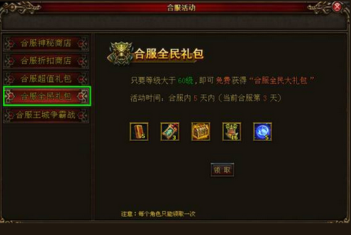 合服的好处很多,一般来说对各个游戏玩家的好处都是很好的, 合区活动持续5天,从合区当天算第一天,连续5天都有活动,免费的有合服全民礼包和合服王城争霸,其他三个是折扣商店以及神秘商店、超值礼包,而且合服第一天挖宝烈焰神器上架哦。 在合区5天内,只要你的角色等级大于60级,就可以免费领取“合服全民大礼包”,每个人只能领一次哦,打开合服活动就可以领取了。礼包里面含有三倍经验(8小时)x 5、功勋卷轴 x 3、超级金币箱 x1、封魔岭弓箭手召唤令x16、灵兽精魄x5,都是一些好东西,平常都得花元宝购买的,价值很高的,千万不要忘记领取,到了第6天就领不了哦。
