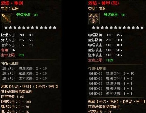 而烈焰神剑的攻击还是非常高的,物理攻击增加390-900,魔法攻击增加175-555,道术攻击增加215-700,而同时装备烈焰神剑和烈焰神甲的玩家,更可获得烈焰套装隐藏属性BUFF。